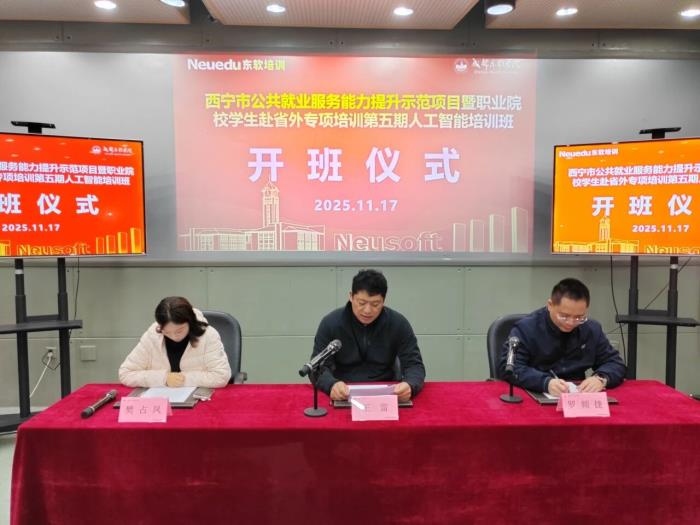 11月17日,西宁市公共就业服务能力提升示范项目暨职业院校学生赴省外专项培训第五期人工智能培训班在成都东软学院举行开班仪式。此次培训旨在为西宁市绿色算力产业发展输送高素质技能人才,标志着两地在校企合作、共育人才方面迈出新的坚实步伐。
