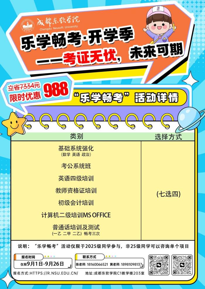 刚踏入成都东软学院的2025级小萌新们,是不是已经开始为大学规划发愁了?想考研却不知道从何入手,想考公、考教资又担心找不到靠谱的课程,考英语四级、计算机二级更是刚需…… 别慌!学校特意为大家准备了 “乐学畅考” 开学季重磅福利,一站式解决你的考证难题,性价比直接拉满!